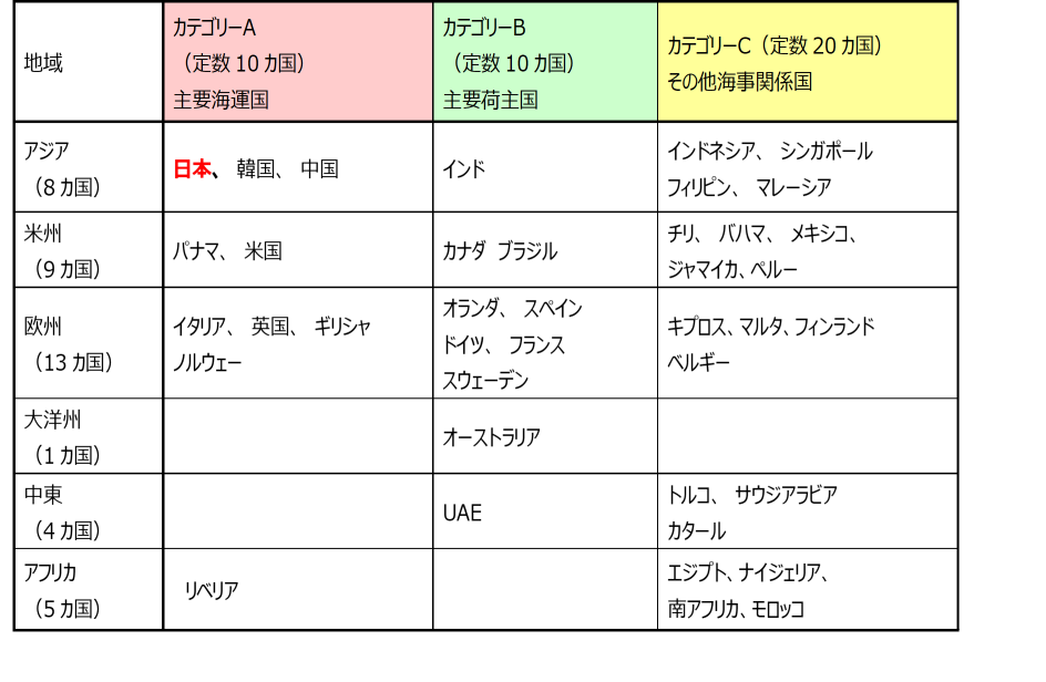 理事国は、カテゴリーA(国際海運業務の提供に最大の利害関係を有する国:主要海運国)、カテゴリーB(国際海上貿易に最大の利害関係を有する国:主要荷主国)、カテゴリーC(その他の海上運送又は航海に特別の利害関係を有する国:その他海事関係国)に分類され、我が国はIMO設立以来の理事国として、IMOの活動に積極的に参画しています。