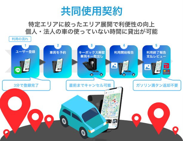 専用アプリとスマートキーを活用し、登録すれば誰でも簡単に参加できる仕組みに。貸す側は維持費の軽減、借りる側は自由な移動手段の確保と、双方にメリットを生む設計です。
