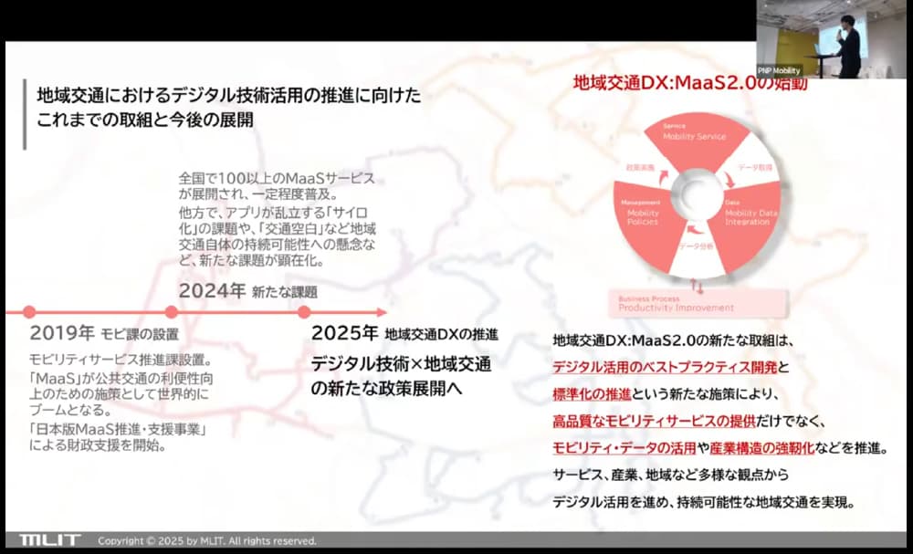多様な交通事業者や関連企業、スタートアップ、自治体職員などと意見を交わす中で、地域交通の構造的な課題や今後取り組むべき方向性についての整理を進めてきたと話す。2024年9月に開催された『地域交通を変革するMaaS 2.0~テクノロジードリブンで地域交通DXを加速~』では、地域交通DXの構想を披露し、議論を活性化させてきた。