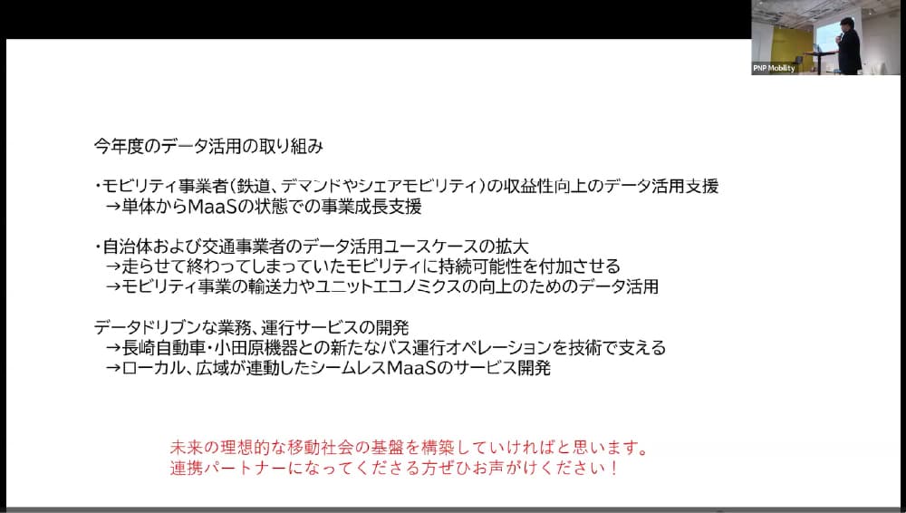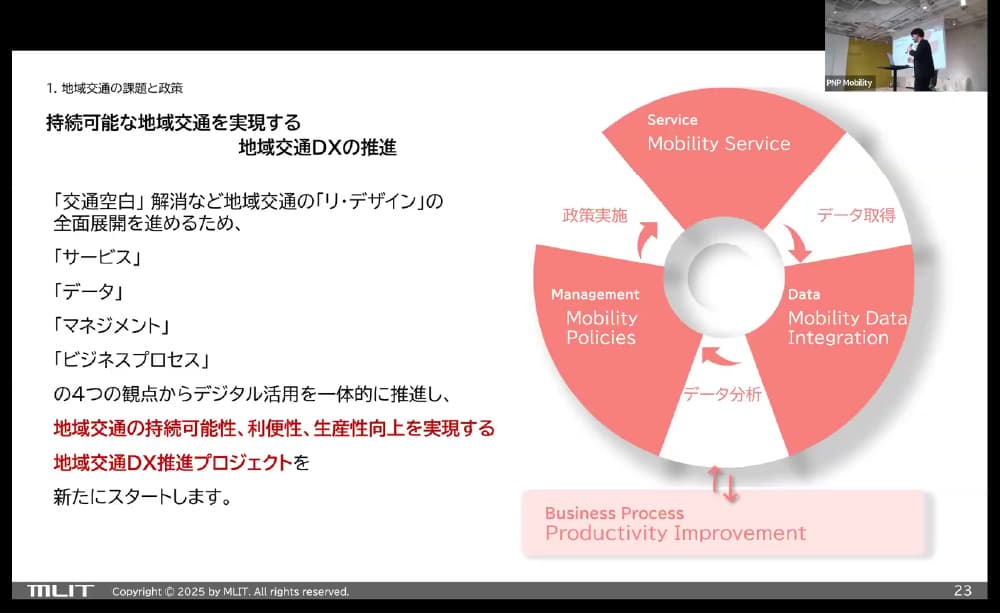 最後に2025年度の取り組みとして、「モビリティ事業者の収益性向上に資するデータ活用支援」、「自治体および交通事業者のデータ活用ユースケース拡大」、「業務設計・運行管理のデータドリブン化」を挙げ、実装と成果の蓄積を通じて、より解像度の高い政策設計につなげていく意義を強調した。
