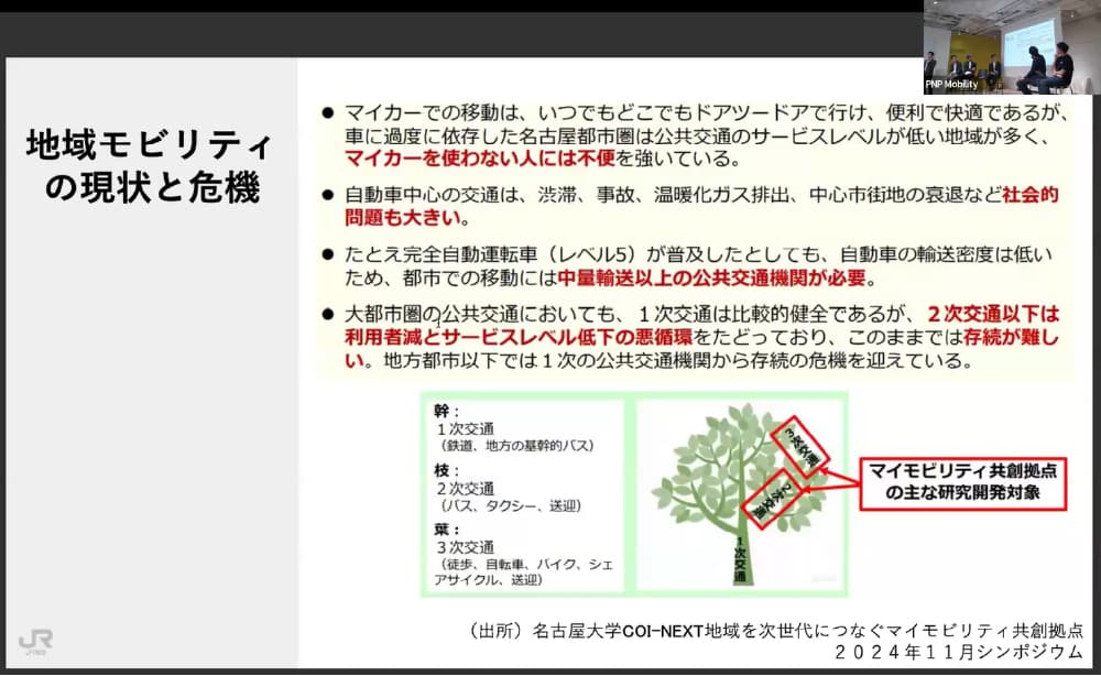 JR東海では、名古屋大学を中心とする「COI-NEXT 地域を次世代につなぐマイモビリティ共創拠点」に参画し、地域横断的な対話と実証を重ねている。後藤氏は「一対一の関係では話しづらいことも、広域の連合体であれば対話が進みやすくなる」とその効果を語った。