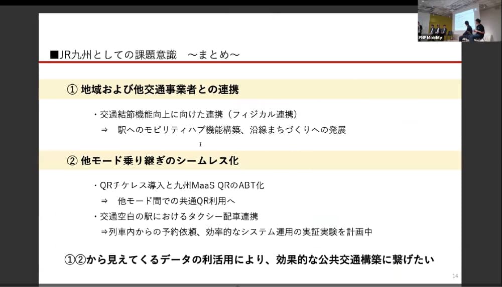 第2部「JR各社からみる地域交通の課題」では、JR東日本・JR西日本・JR東海・JR九州の各社が登壇し、「鉄道や周辺データの利活用」と「地域交通の連携と課題」の2つのテーマに沿って、現場で直面する課題や自社の取り組みを共有した。