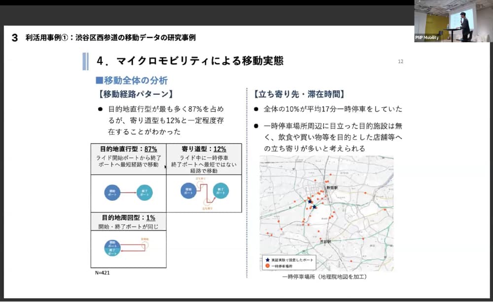 牧田氏は、「数百メートル単位の立地の違いが、移動の目的や行動パターンに大きく影響している」と述べ、マイクロモビリティならではのデータが都市空間の設計やまちづくりに有用であることを強調した。
