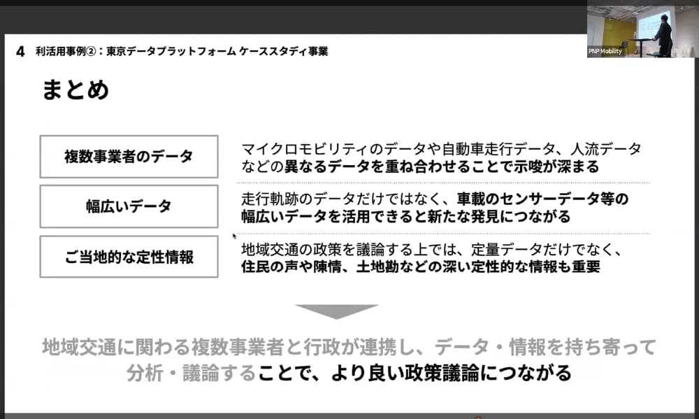 牧田氏は、「行政や事業者が持つデータを持ち寄ることで、政策につながる多様な気づきが得られる」と語り、マイクロモビリティのデータが今後の交通政策やまちづくりに果たす可能性を示した。