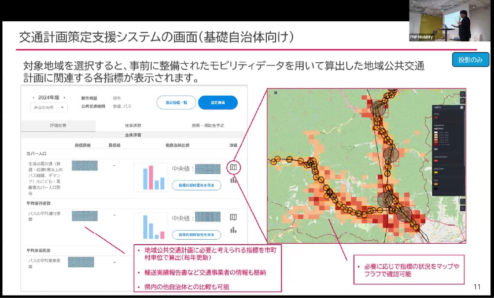 広域自治体向けには、管内の交通課題と施策の状況を俯瞰し、他自治体への共有も可能にする機能を備えている。実際に群馬県みなかみ町や渋川市では、同システムを活用した交通計画の施策を行い、一定の工数削減や課題の見える化といった成果が得られた。