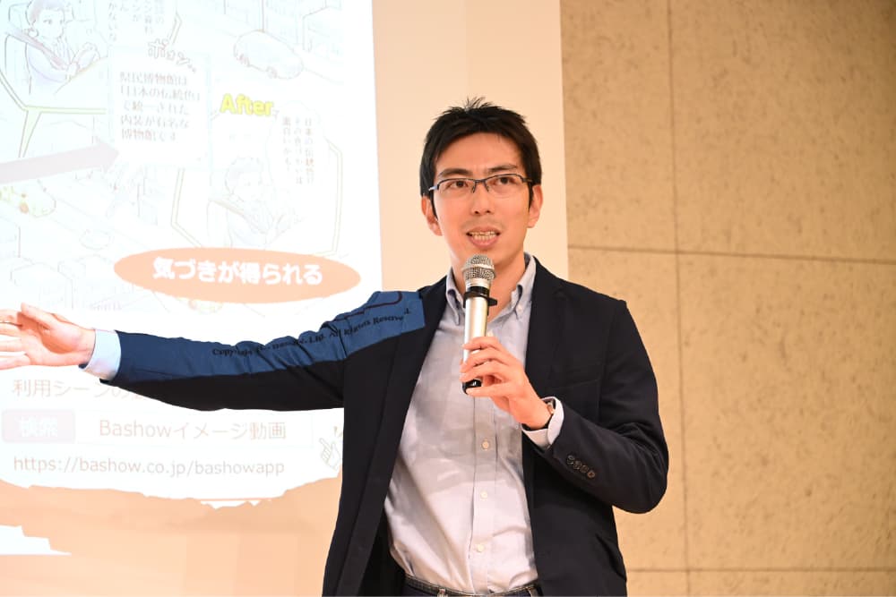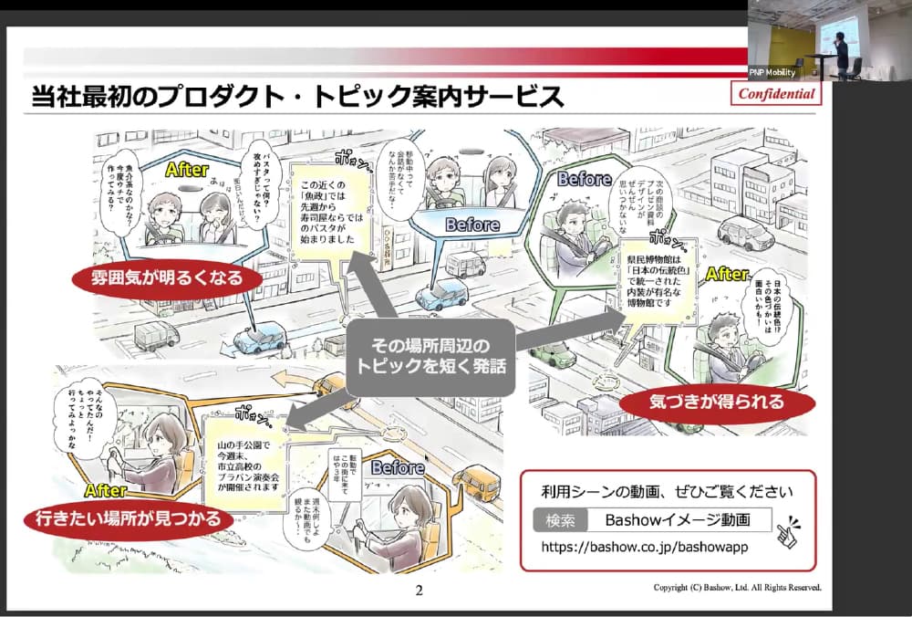 最初に登壇したのは、株式会社Bashow。「車載アプリ多様化時代の地域交通DX」と題し、車で移動中に周辺のおすすめスポットやイベントなどの話題を音声で案内するトピック案内アプリ「Bashow」を紹介した。2024年度には、さいたま市、掛川市、御前崎市、横浜市などで運用され、2025年5月時点で1,000人以上が利用。利用者アンケートでは85%が「今後も使いたい」と回答しているという。今後は首都圏や名古屋などへ拡大を予定しているとのこと。