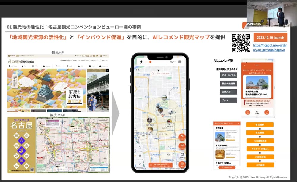 事例としては、名古屋観光コンベンションビューローと連携した「AIレコメンド観光マップ」や、大阪・関西万博期間中のオーバーツーリズム回避を目的とした大阪広域データ連携基盤(ORDEN)との取り組みを紹介。今後は、「NOSPOT」のAIレコメンド機能をAPIとして他社・自治体へ展開し、観光・MaaS領域での活用拡大を目指すという。