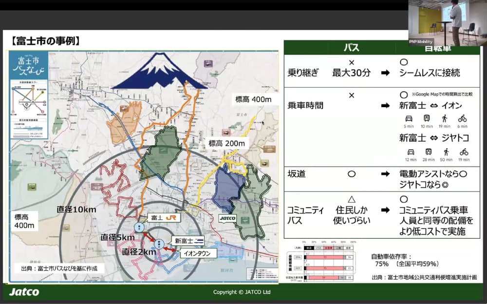 富士市での活用事例では、新富士駅・富士駅からのバス接続が不便な地域において、自転車による移動が有効な選択肢となることを実証。坂道の多い地域でも、電動アシストによる快適な走行と健康促進を両立し得るモビリティとしての可能性が示された。今後は、シェアモビリティ事業者との連携も視野に入れているという。