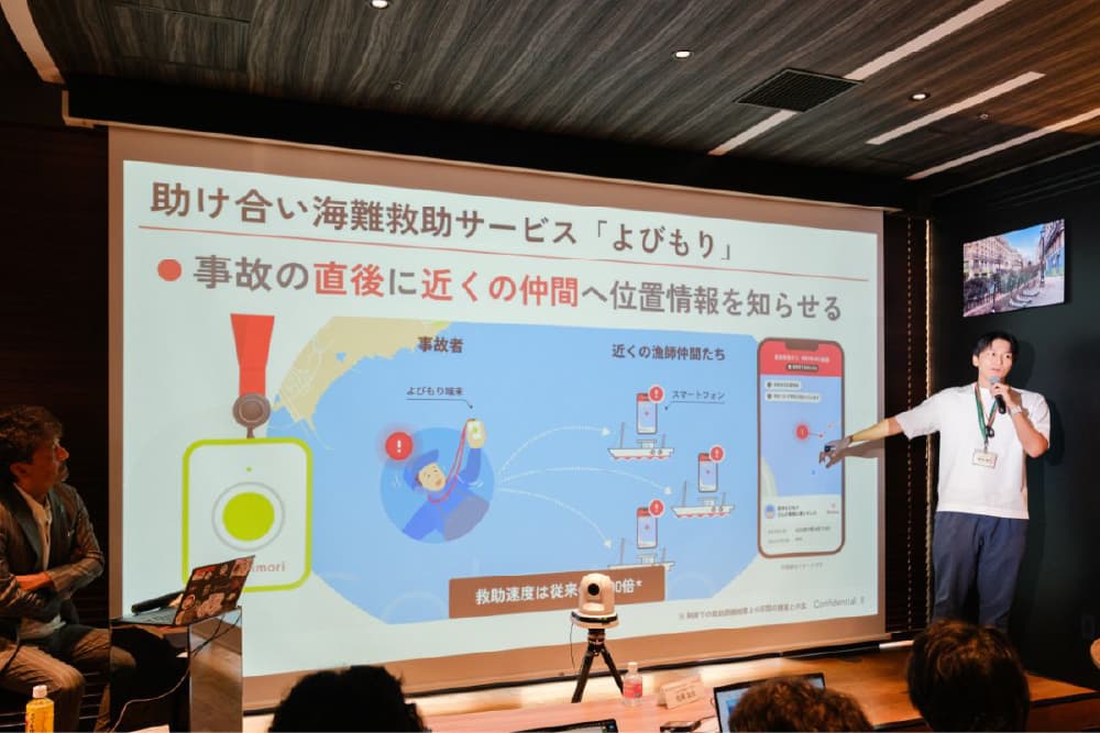 株式会社よびもりは、海難事故の発生時に、最寄りの船が迅速に救助に駆けつける助け合い海難救助サービス「よびもり」を提供している。同社代表取締役の千葉氏は、「海に出た船が事故に遭ったときに、他者がその事故に気づき、海上保安庁の救助船が現場に駆けつけるまでに、状況によっては最大12時間もの時間がかかってしまうことがある」と海難救助の課題を説明。時間が経つほど救助は困難になるため、「初動を早めることが非常に重要になる」と指摘した。