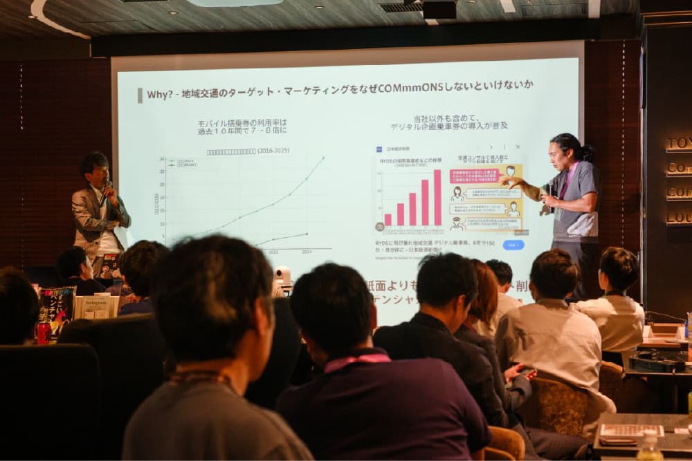同社では、人流・交通流や来店履歴、位置情報など多様なデータを連携・分析したうえで、具体的な施策を展開し、地域や建物の人流マネジメントの最適化を図っている。例として、演劇祭のチケットとバスの一日乗車券のセット販売や水上交通のデジタル化支援、デジタル化と連携した地域イベントのプロデュースなど、さまざまな取り組み事例を紹介。モビリティ単体でのマネタイズの難しさを指摘し、不動産など他の分野との連携の重要性を強調した。