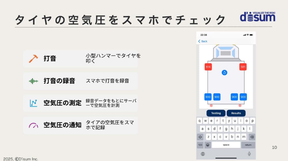 モビリティ領域では2つのソリューションを開発している。1つ目は、大型車両のタイヤ空気圧をスマートフォンでチェックする仕組み。従来はドライバーがタイヤを叩いて音を聞き判断していたが、スマホで打音を録音・解析することで精度の高い診断を可能にする。2つ目は、交通事故リスクを高める睡眠時無呼吸症候群(SAS)のスクリーニングアプリ「SAS’EYE」。寝ている間の呼吸音を録音するだけで、従来の煩雑で高額な検査に代わり、簡便にリスクを把握できる。