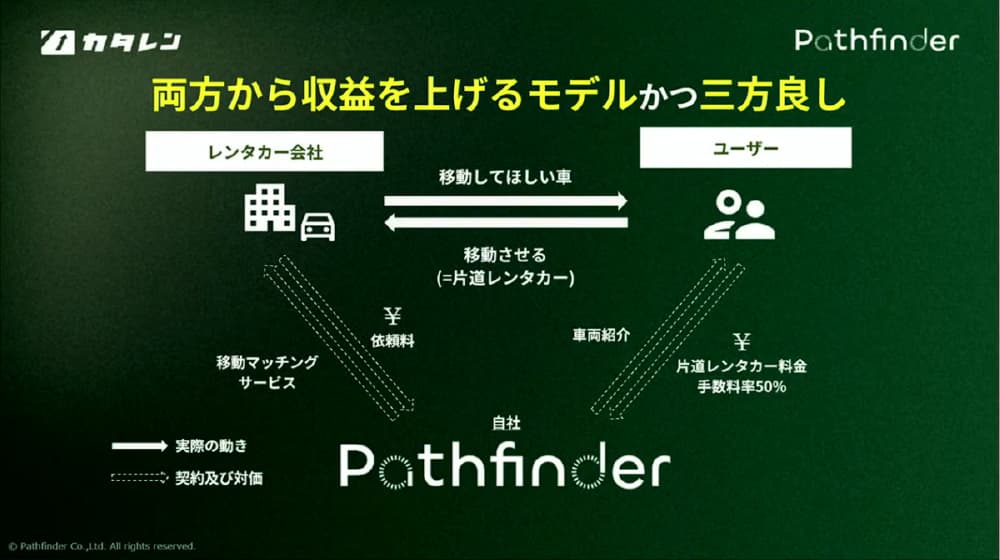 Pathfinder株式会社は、「車両配置の最適化を通じ、移動のハードルを下げる」を掲げ、片道レンタカーサービス「カタレン」を展開している。従来の片道レンタカーは返却コストが高く、通常1泊2日で1万円程度のレンタルに対して乗り捨ては約4万円と割高で、利用は全体の1割にとどまっていた。「カタレン」は、返却が必要な車両を「戻りたい方向に移動する利用者」とマッチングし、アウトレット感覚で安価に提供する仕組みだ。これにより稼働率が向上し、車両台数を最大3割削減する効果もあるという。