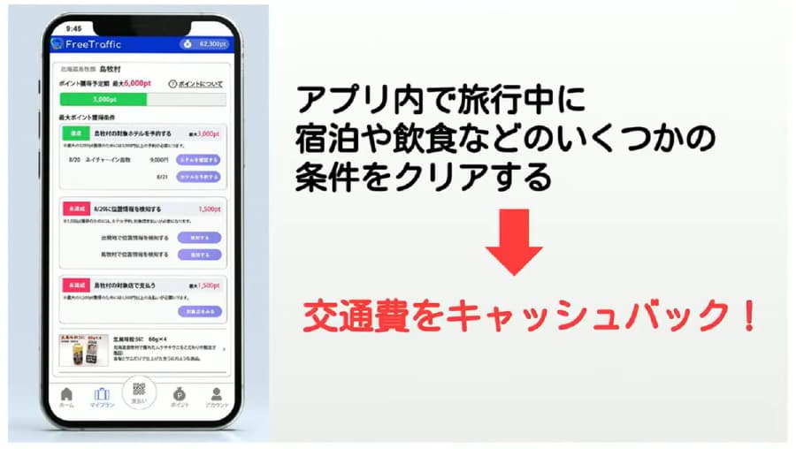 仕組みはシンプル。旅行者が現地で宿泊や飲食など一定の条件を満たすと、移動距離に応じた交通費がアプリ内でキャッシュバックされる。交通費は一人当たりの旅行支出全体の約2割に過ぎず、残りの約8割が旅行先に落ちているという。旅行先の自治体や宿泊施設、飲食店などが交通費を負担しても、それ以上の投資効果が期待できるわけだ。