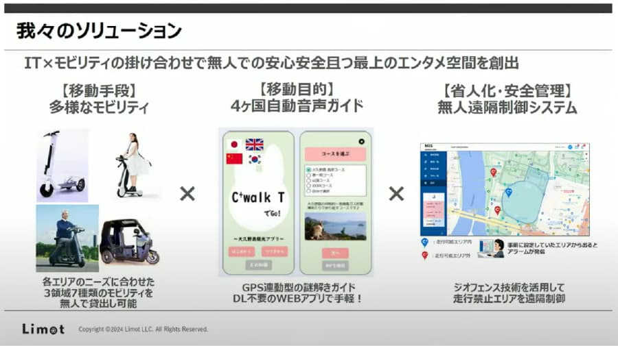 合同会社Limotは、モビリティを単なる移動手段ではなく「目的地での体験」と組み合わせることで、地域の価値を高めるサービスを展開している。創業メンバーは、トヨタで都市開発・観光開発事業における回遊性向上のコンサルティングに従事していた経歴があり、ソフトウェアによるまちづくりに強みを持つ。