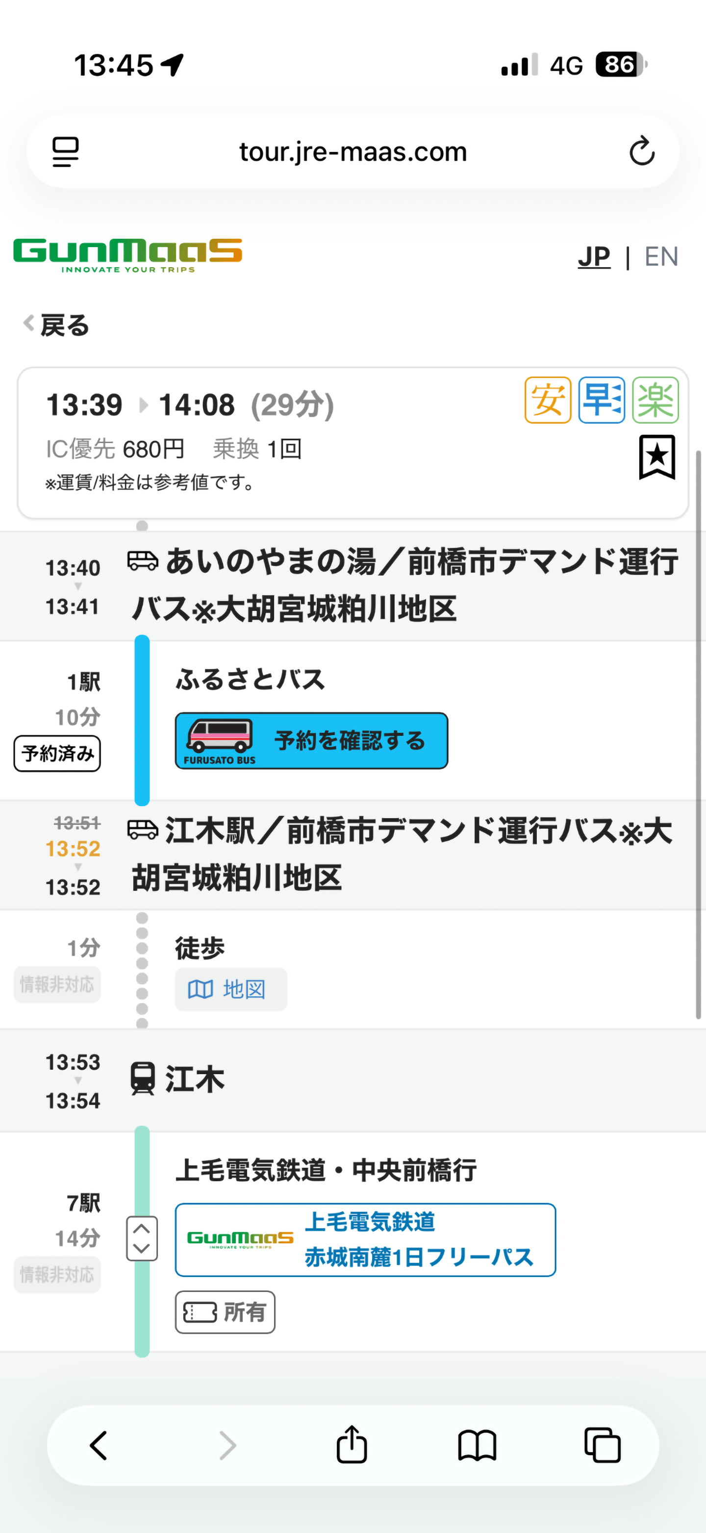 「②高度な経路検索の実現」については、2025年11月18日から2026年3月19日までを実証期間とし、デマンド交通の予約状況および運行情報を反映した検索ロジックを実装し、GunMaaS上で提供しました。