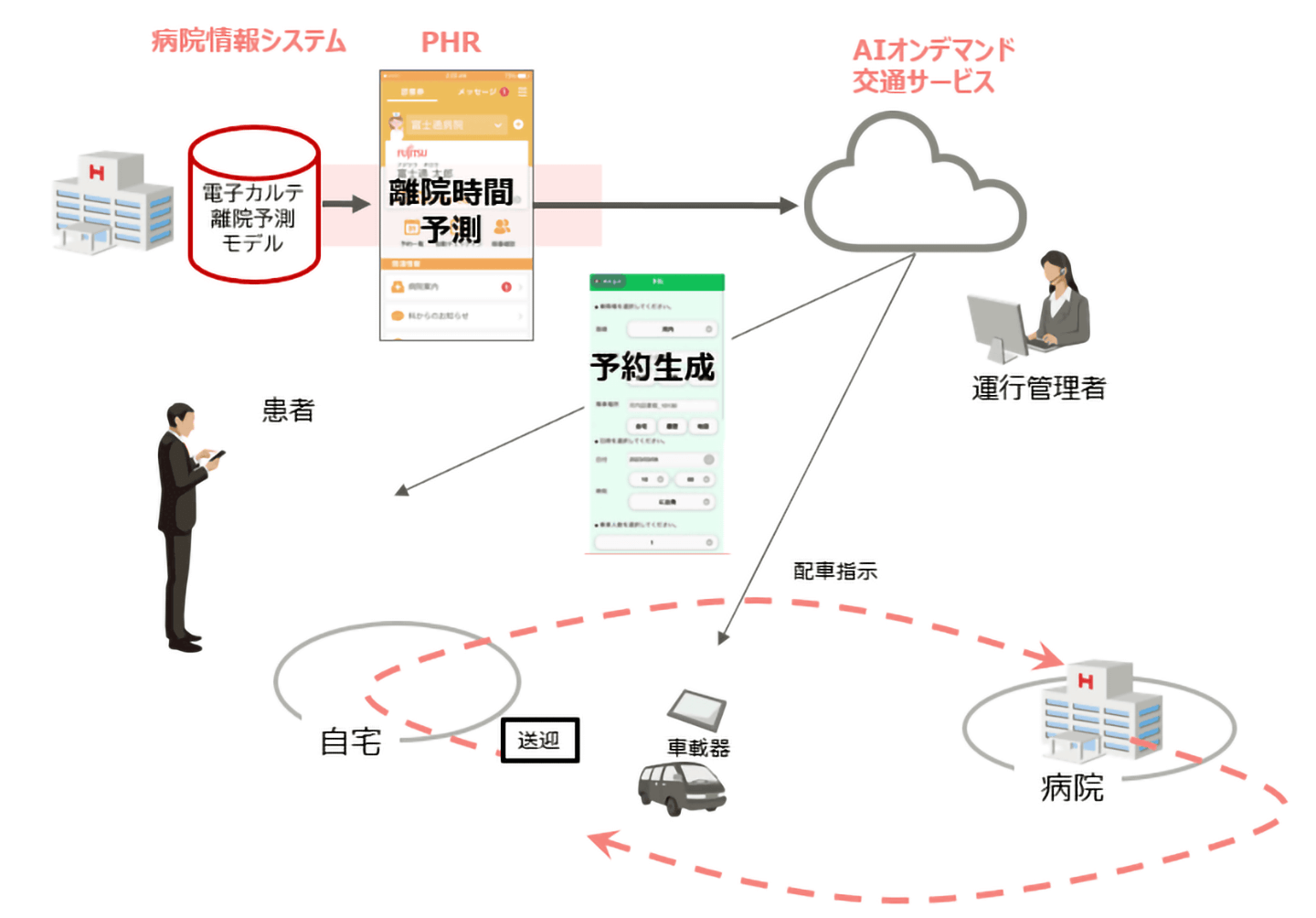 本実証は、徳島県立中央病院をフィールドに実施されました。同院で稼働する富士通製電子カルテシステムと、富士通製デマンドバス配車システムを連携させるインターフェースを構築し、2025年11月4日から12月26日までの約2か月間、実証運行を行いました。