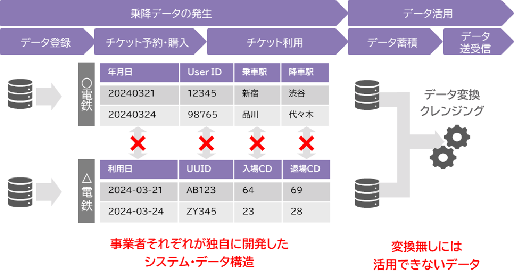 しかし実際には、事業者ごとに記録形式やデータ項目が異なっており、いざ活用しようとすると、データの読み替えや成形に大きな手間がかかるのが現状です。