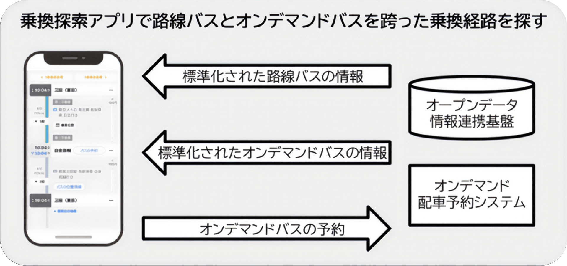 今回のプロジェクトでは、国内で広く普及している乗換探索アプリとオンデマンド配車予約システムを国際標準仕様(GTFS-Flex、GTFS-Ondemand)で連携させ、より自然なUXで使える仕組みを検証します。特定のアプリに依存せず、どの経路でも一貫した移動体験の提供を目指しています。