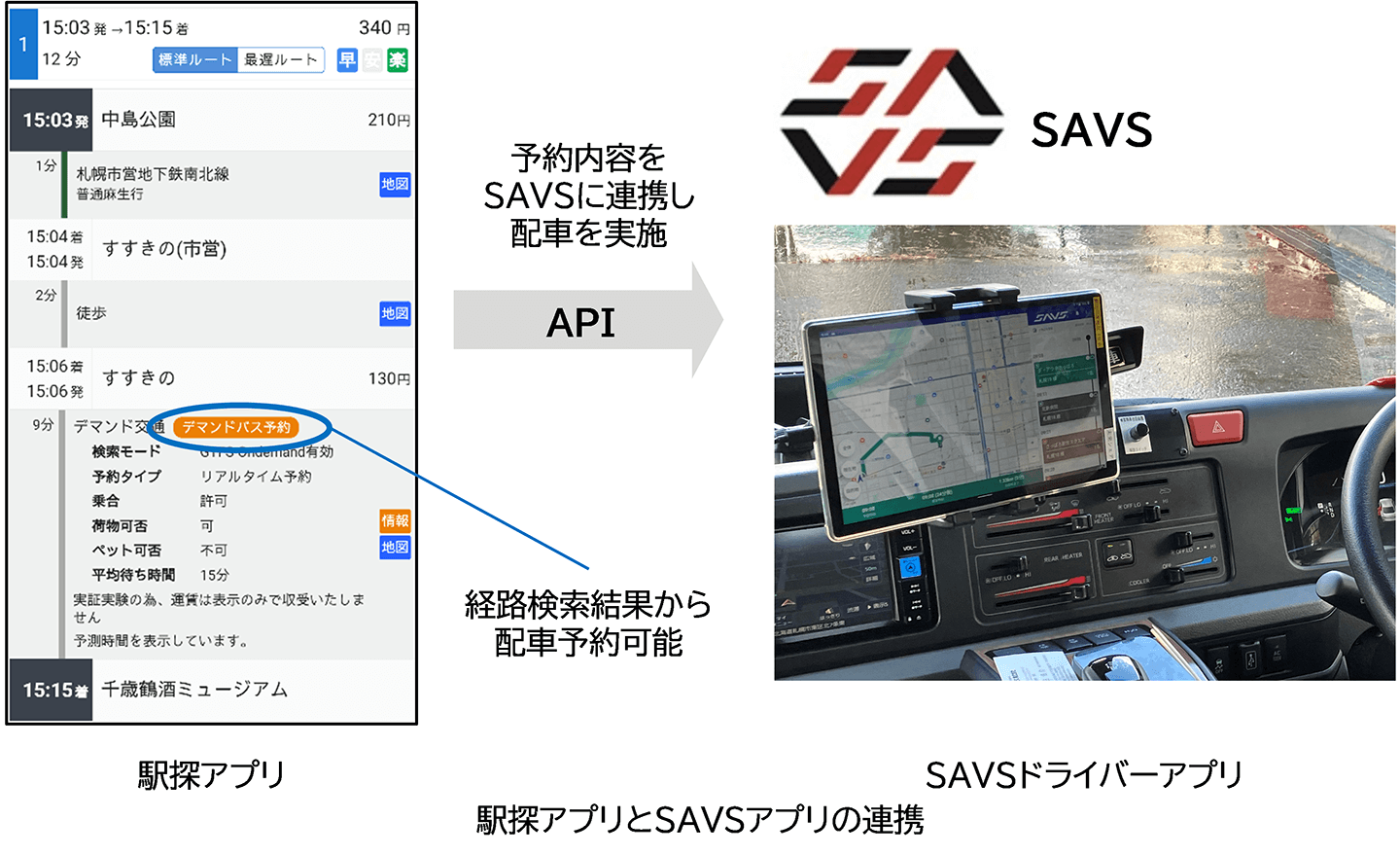 利用者は、一般的な乗換検索アプリ上で経路を検索し、定時定路線とオンデマンドバスを含む経路提案を確認します。そのままアプリ上でオンデマンドバスの予約までを行い、実際に車両へ乗車する一連の流れを体験しました。
