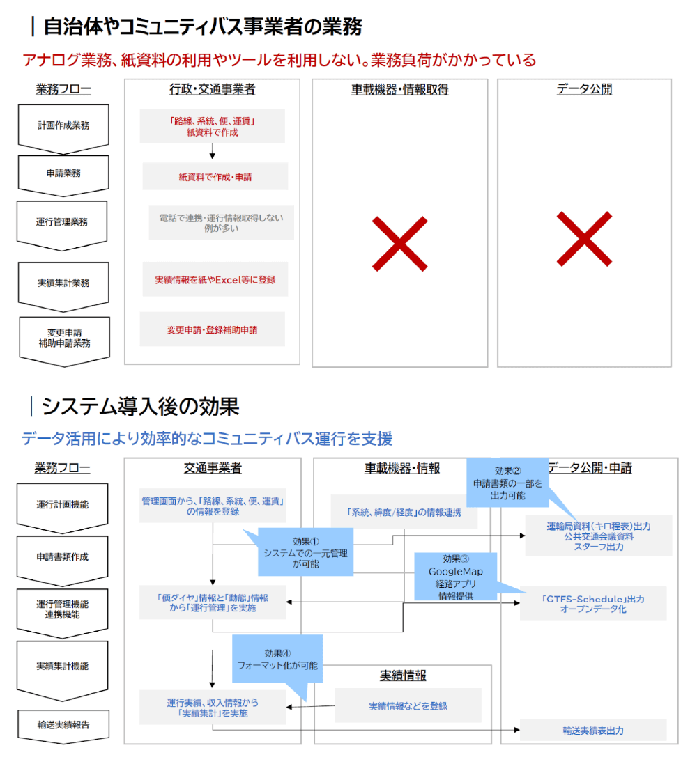 路線、系統、便、運賃は紙の資料で作成。実績の集計はExcel、GTFS(標準的なバス情報フォーマット)への対応も手作業――。全国の多くのコミュニティバスは今も、人手に頼るアナログな手法で日々の業務をこなしています。地域住民の移動を支えるインフラでありながら、その運営現場には大きな負担が残っています。