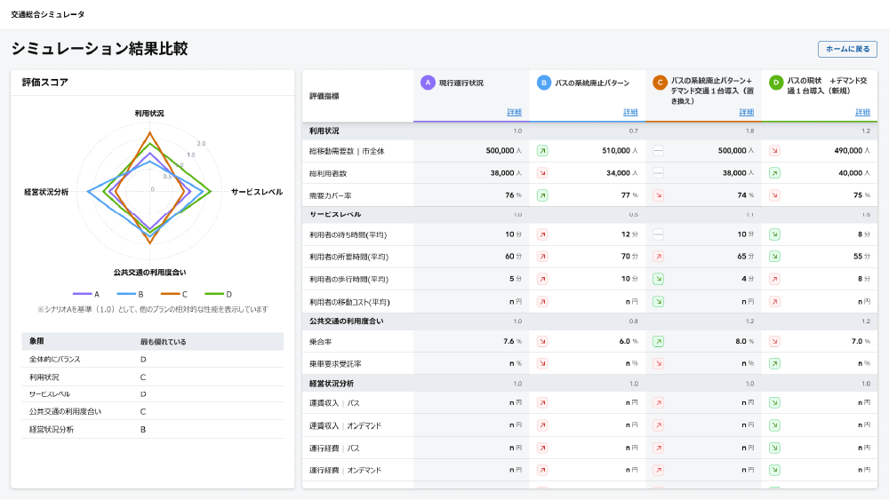 さらに、AIモデルにより選択された移動経路や交通手段に基づき、車両や利用者の動きを再現するマルチエージェント・シミュレーションも実装。利便性や経済性を自動で算出し、効果を定量的に把握できる点も大きな特徴です。
