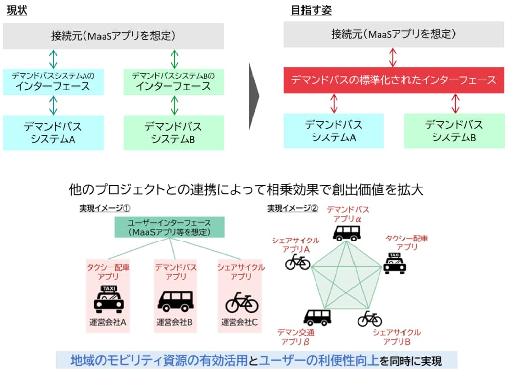 今回のプロジェクトでは、MONETが提供する「デマンド交通キット」をベースに、共通インターフェースとなるAPIを整備。他社のシステムと連携できる仕組みをつくり、実際にその有用性を検証していきます。