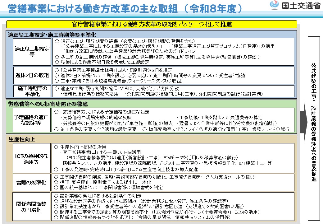 令和8年度からは、第三次・担い手3法(令和6年度改正)等を踏まえ、更に「多様な働き方の支援」「工事における猛暑対策の拡充」「労務費等へのしわ寄せ防止の徹底」「業務における余裕期間制度・スライド制度の試行」を実施し、営繕事業における働き方改革をより一層推進していきます。