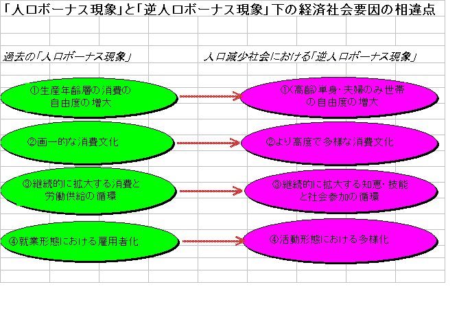 図表 「人口ボーナス現象」と「逆人口ボーナス現象」下の経済社会要因の相違点