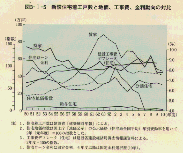 図表 新設住宅着工戸数と地価、工事費、金利動向の対比