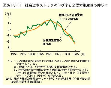 (図表1−3−8)。また、社会資本には、国内経済における生産活動の中で、「労働力」や機械設備等の「民間資本」という生産要素と同様に経済を活性化させる効果(社会資本の生産力効果)があり、社会資本ストックの伸び率が大きいときはTFP(全要素生産性)の伸び率も大きいという関係が認められる