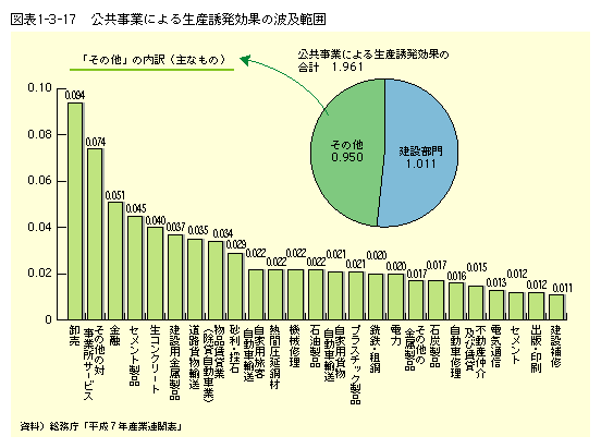 次に、フロー効果について見ると、公共投資は、民間需要の低迷が続きデフレ・スパイラルの懸念もあった経済状況において景気の大きな下支え効果を果たしてきたほか、公的需要の波及効果を通じてGDPを押し上げる「乗数効果」や、建設部門のみならず幅広い産業分野における生産を誘発する「生産誘発効果」を有している