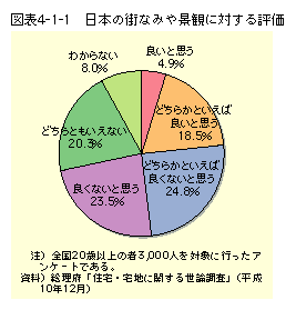 しかし、これまでの我が国の都市景観を振り返ると、必ずしも賞賛されるべきものばかりではなく、反省すべき点が多い。総理府の実施した世論調査「住宅・宅地に関する世論調査(平成10年12月)」においても、我が国の景観については、否定的な評価を持つ人が多いことが分かる(図表4−1−1)。