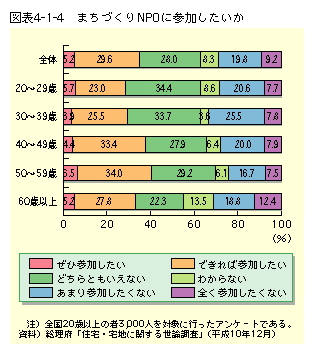 このように、良好な景観を形成するための施策を推進するためには、住民とのコミュニケーションの下で、地域のあるべき姿をビジョンとして分かりやすく定め、住民・行政等がコンセンサスを形成していくプロセスが大切である。この場合、全国一律の手法による景観の形成を目指すのではなく、地元市町村と地元住民が、地域の歴史・風土が生み出す個性や地元のニーズに応じて弾力的な対応ができるよう、公共施設の整備と一体となった景観形成のための事業実施を含め、自主性を発揮できるためのツールが多く備えられていることが必要である。「住宅・宅地に関する世論調査」においても、街なみや景観を良くする責任の所在について、地方公共団体のほか、建物の所有者や住民グループに期待が寄せられており(図表4−1−3)、また、まちづくりNPOへの参加に関して前向きな姿勢が見られており、今後、このような住民の活動が景観づくりに積極的に関わってくることが期待される(図表4−1−4)。