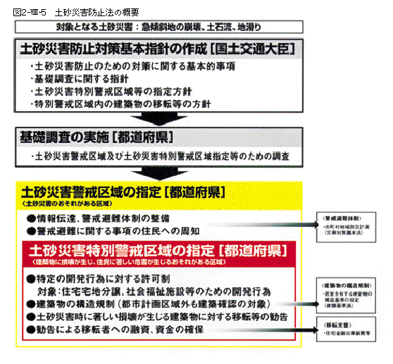 建設省は「総合的な土砂災害対策に関するプロジェクトチーム」を開催し、土砂災害防止のための総合的な対策に関する法制度の整備、総合的な土砂災害対策に関する支援措置について検討を進めた。この検討結果を踏まえ建設大臣は河川審議会に総合的な土砂災害対策のための法制度のあり方について諮問し、平成12年2月答申された。この答申を受け、建設省は、既存の事業関連諸制度と相まって総合的な土砂災害対策を講じるため、土砂災害のおそれのある区域についての危険の周知、警戒避難体制の整備、住宅等の新規立地の抑制、既存住宅の移転促進等のソフト対策に関する新たな法制度として「土砂災害警戒区域等における土砂災害防止対策の推進に関する法律」を国会に提出した。平成12年5月8日に公布され、平成13年4月1日から施行される