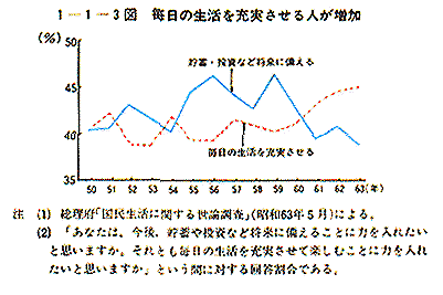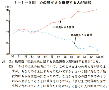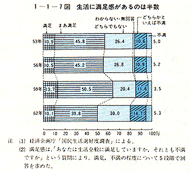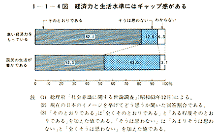 このような状況のもとで、物質的な要求はほぼ充たされ、国民は、かつてない消費文明を謳歌しているように見受けられるが、実際の生活面では豊かさを実感するほど充たされておらず、我が国の経済力の高さに比較し、国民の充足感は必ずしも高いとはいえない状態にある〔1−1−4図〕。