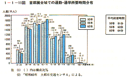 このような状況のもとで、大都市圏においては、地価の高騰等新たな交通施設の整備を著しく困難にする制約等があることから、巨大に膨れ上がった交通需要に交通施設の整備が追い付かない状況にある。このため、大都市圏におけるサラリーマン、OL、学生等は、その多くが激しい混雑に耐えながら長時間の通勤通学を強いられているほか〔1−1−10図〕、道路交通については、慢性的な交通渋滞が生じるなどの交通問題がますます顕著になり、都市機能の維持や良好な住環境の形成が難しくなりつつある。