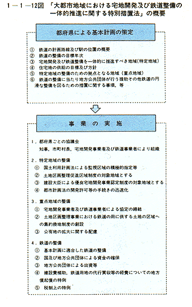 本法の概要は、〔1−1−12図〕のとおりである。当面の適用対象プロジェクトとしては、都心と筑波研究学園都市を結ぶ常磐新線が考えられており、現在、関係する1都3県をはじめとする関係者間でその具体化に向けての検討を進めているところである。