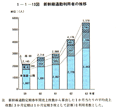 - 従来の在来線による通勤圏とされる都心から約50km圏内に、平均的なサラリーマンが通常の所得の範囲内で住宅を取得することは、困難な状況になっている。こうした事情から、例えば都心から100km以上離れた宇都宮、高崎、三島等の新幹線停車駅周辺に一戸建て住宅を取得し、通勤用新幹線定期券(フレックス)を利用して都心の勤務地に通う新しい通勤形態が最近顕著な拡大傾向を示している〔1−1−13図〕。