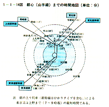 新幹線を利用すれば、通勤利用時間を在来線利用の場合の半分以下に短縮でき、通勤可能圏が地価の比較的低水準な地域へ飛躍的に拡大することから〔1−1−14図〕、現下の厳しい住宅事情に悩む大都市勤労者にとっては、今後とも新幹線通勤が環境に恵まれた良質なマイホームを確保するための有効な一手段となることが見込まれる。