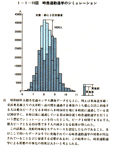 - これまで述べたような都市鉄道の整備等のほかに、ピーク時の混雑を解消する抜本的方策としては、特定の時間に集中する需要を分散させる方策が有効である〔1−1−15図〕。