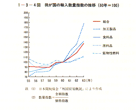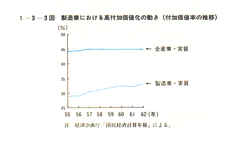 我が国企業は、大幅な円高に対応し、製造業を中心に、マイクロエレクトロニクス技術、情報関連技術を活用した製品の高付加価値化を進め〔1−3−3図〕、内需拡大をめざすとともに、輸出品の高度化を図っている。また、海外からの中間原材料・部品の調達、製品輸入を増やすとともに〔1−3−4図〕、海外直接投資を通じて、生産、販売等の最適立地をめざしており、これらによりNIEs等との水平分業が進展しているといえよう。