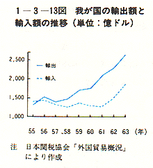 - 我が国の経常収支は、昭和61年度に史上最高の941億ドルもの黒字を計上した後、縮小頃向を見せたが、63年度においても773億ドルという巨額の黒字を記録している。このような大幅な不均衡を背景として、60年9月のプラザ合意以降、円高が大幅に進行し、63年度平均では1ドル=128円となっており、60年9月に比べ円の価値はドルに対し約2倍になった。また、経済摩擦に伴って輸入制限や輸出自主規制といった措置が採られる等、輸出環境も悪化してきている。