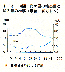 これらの物流の変化を数量の面から見ると、暦年ベースで60年から63年にかけて、輸出量では、61年は対前年比7.3%減、62年は同4.7%減、63年には同0.6%減と減少している。また、輸入量では、同期間でそれぞれ1.1%減、3.4%増、9.2%増とかなりの伸びを示しており、我が国の輸入の拡大を裏付けている〔1−3−14図〕。