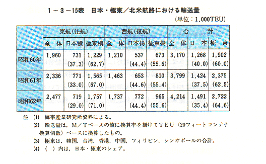 また、世界の外航定期航路のうち、最大の荷動き量を誇る日本・極東/北米航路の輸送量についてみると、昭和62年で対前年比10.9%増となっているが、その伸びのほとんどが日本以外の極東揚積の貨物によることがわかる〔1−3−15表〕。