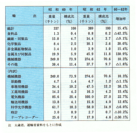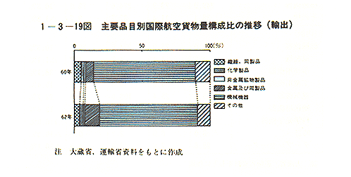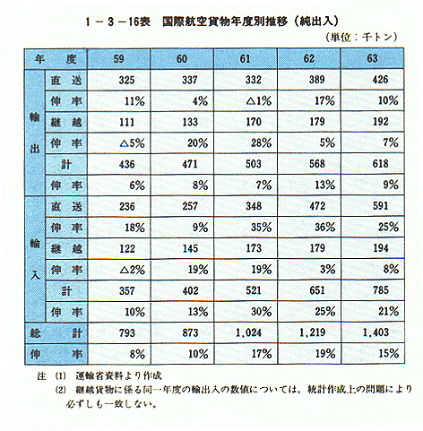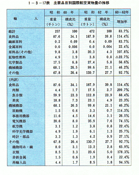 まず、日本全体の継越も含めた国際航空貨物の出入り量は、〔1−3−16表〕に示すとおり、昭和60年度以降毎年10%以上の伸び率で推移してきているが、特に、ここ2〜3年は輸入を中心に急増しており、61年度以降輸入が輸出を上回っている。
