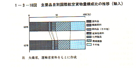 主要品目別の国際航空貨物量構成比の推移をみると、〔1−3−18図〕、〔1−3−19図〕に示すとおり、輸入食料品の構成比の増加が顕著であり、グルメ志向や食生活の変化等により海外の高級食料品や輸入ウィスキー、ワインなどが消費されるようになったことも一因と考えられる。