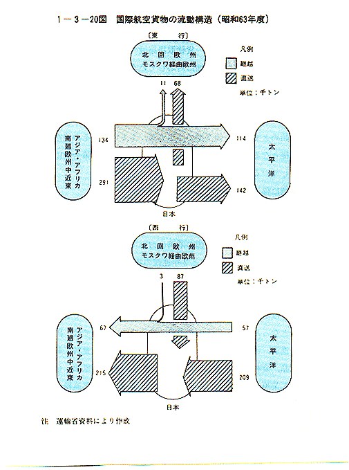 - ここ数年来、主要輸出メーカーは国際競争力の強化等のため、海外現地生産へのシフトを進めてきた。その結果、高技術品は国内生産、中・高級品は先進国の現地生産、コスト競争力の低下した中・低級品は海外生産委託と水平分業が定着しつつある。こうした生産構造の変化は、部品や中間製品の国際間の移動を増加させるとともに、我が国への製品輸入の増大等をもたらしている。例えば〔1−3−20図〕は、太平洋航空貨物市場における貨物流動構造を示したものであるが、日本、北米、東南アジアの三極化が進展していることがわかる。