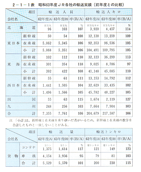 - 昭和63年度の旅客会社及び貨物会社の鉄道輸送は、青函トンネル及び瀬戸大橋の開通並びに国内の好景気に支えられたこと等によりおおむね順調に推移した。その概要は〔2−1−1表〕のとおりである。