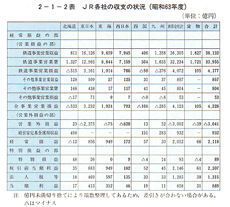 - JR各社は、平成元年6月下旬、昭和63年度の貸借対照表、損益計算書及び営業報告書を運輸大臣に提出したが、このうち、各社の収支の状況及び資産・債務の状況は〔2−1−2表〕及び〔2−1−3表〕のとおりである。