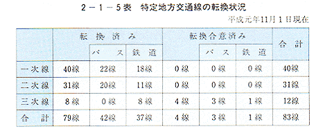この経過措置に基づき、昭和62年4月1日以降、平成元年11月1日までに26線が転換(バス8線、鉄道18線)され、残る4線についても地元特定地方交通線対策協議会会議で転換の合意(バス3線、鉄道1線)がなされており、特定地方交通線83線約3,157km全線の転換が決定されている。